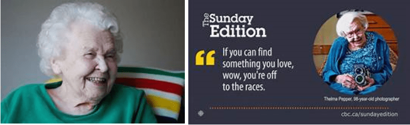 Take the late Thelma Pepper (1920-2020). I have been following her career for many years but it was only on her passing that I looked deeper into her life and felt the inspiration come through. How could her story not be inspirational? If you have never heard of Thelma Pepper, a celebrated Saskatchewan photographer, all you need to do is ask Google, and you will get a smorgasbord of information. In fact, I’ve included some links to a few pieces you can read. There are many good articles written about Thelma, so I’m not going to get into the details of her life and her achievements, which were many. What fascinates and inspires me, is that she didn’t start until she was 60 years of age, and her four children had all left the house. This seems to be the plight of many women. When we are in our 20’s or 30’s and just starting to find ourselves we “settle down” and have children, devoting all of our time and attention to their lives and endless hours spent driving to soccer, swimming, gymnastics, trying to get supper on the table and stock the cupboard with easy-to-prepare lunches and snacks. And then there life’s problems and heavens, don’t forget the worrying. That never stops! Once the kids grow up (you notice I’m not going to say leave home), we find ourselves with more time on our hands. This is time to spend on ourselves. For example, rather than driving the kids to the soccer fields, we now have time to drive to the pickle ball court!