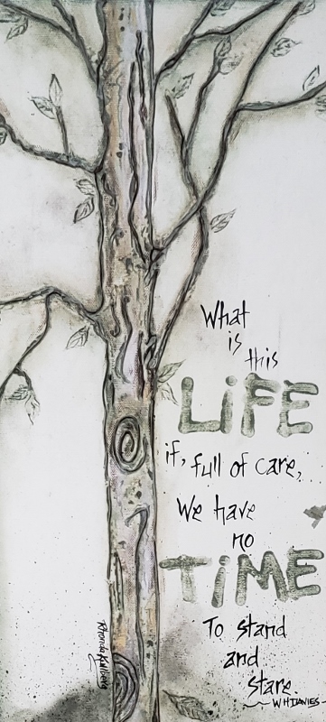 Here’s an interesting side note. My daughters and I recently got away from the city and spent some time in a 100 year old farmhouse. It was a lovely house and we truly enjoyed our brief stay. At the bottom of the stairs there was a wall hanging that caught my eye every time I saw it. It said, “What is this life if, so full of care, we have no time to stand and stare.” –WH Davies